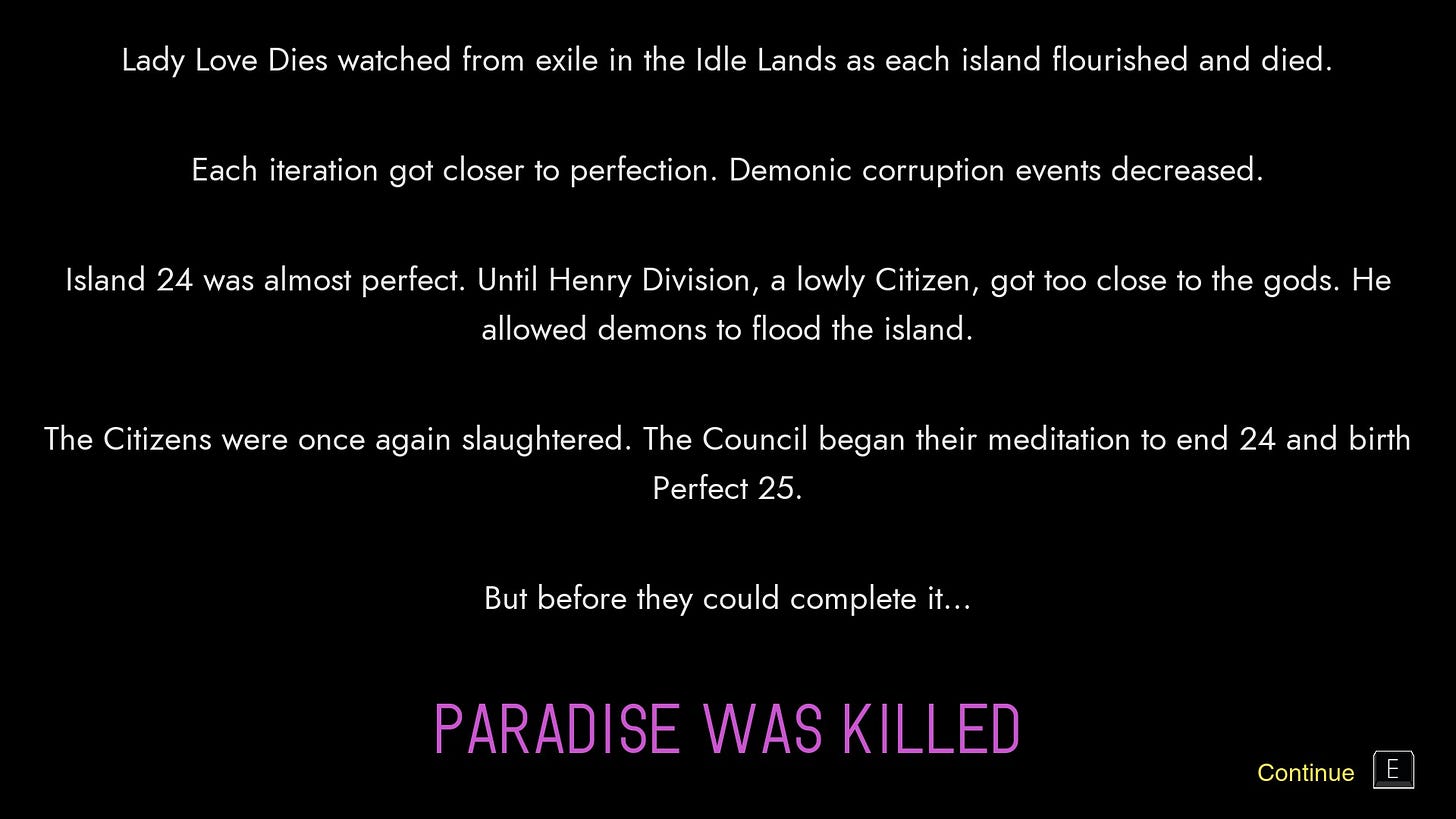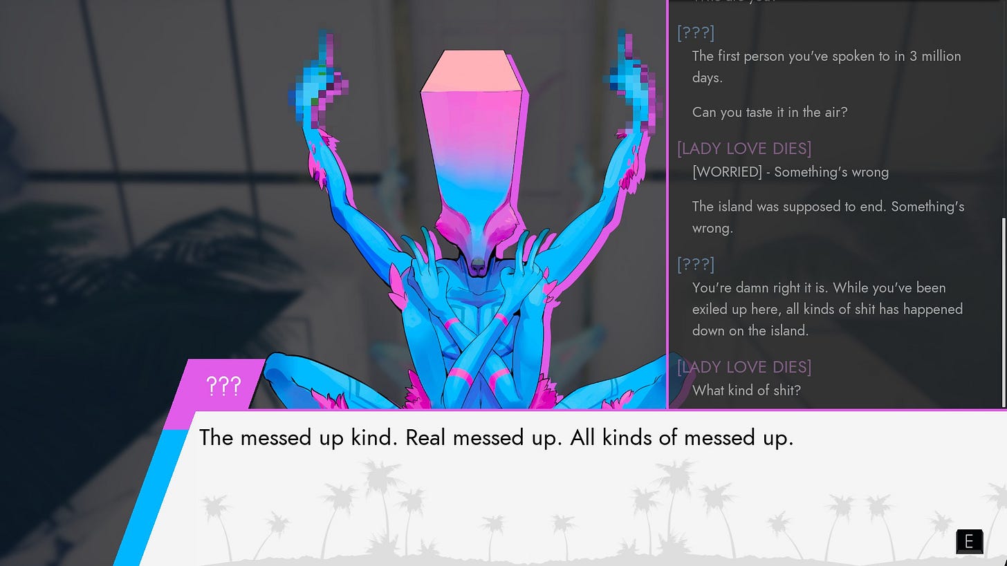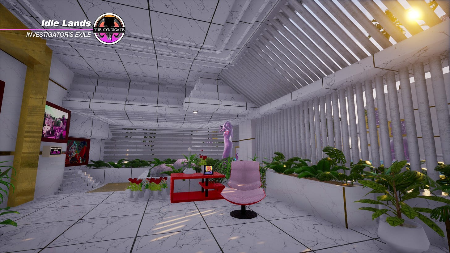 Paradise Killer sees you take the role of Lady Love Dies, an investigator and exiled member of an illuminati-like organization called The Syndicate, whose ageless members engineer island-sized social experiments that they believe will help them resurrect the dead alien gods they worship. When its Council is murdered while transitioning from the 24th island to the 25th, The Syndicate frees Love Dies from her prison in the sky to solve the case, the ultimate detective called down from the cosmos for one last job.
