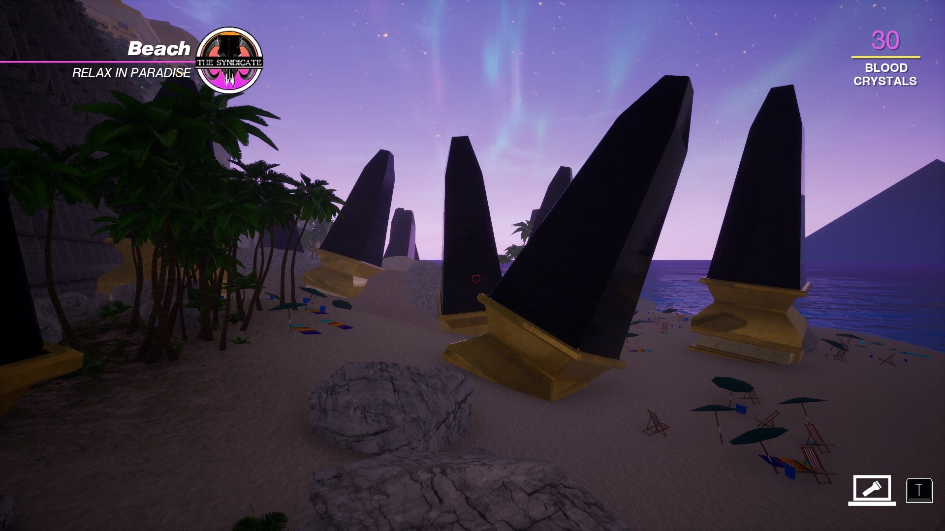 Not Paradise Killer. The 24th island sequence is a vast, decadent open world whose clash of brutal geometry and alien sculptures will fuel an endless curiosity to see more. The daytime washes the island in an incandescent tropical glow, palm trees swaying on its beaches. At night, the wispy threads of winter auroras impossibly light up the skies, giving you the best of both seasons. But that picturesque paradise is cut by architecture that feels coldly functional. Dense apartment units jut out of the cement like spikes as electrical wires clumsily hang overhead. Its beaches are dotted with umbrellas and trees, but also with grotesque, alien obelisks. Secret tunnels cut swiss cheese-like pathways through its bizarre outer shell, and ziggurats hang ominously in the distance. It’s a compelling, one-of-a-kind setting that is both comfortable and disconcerting.