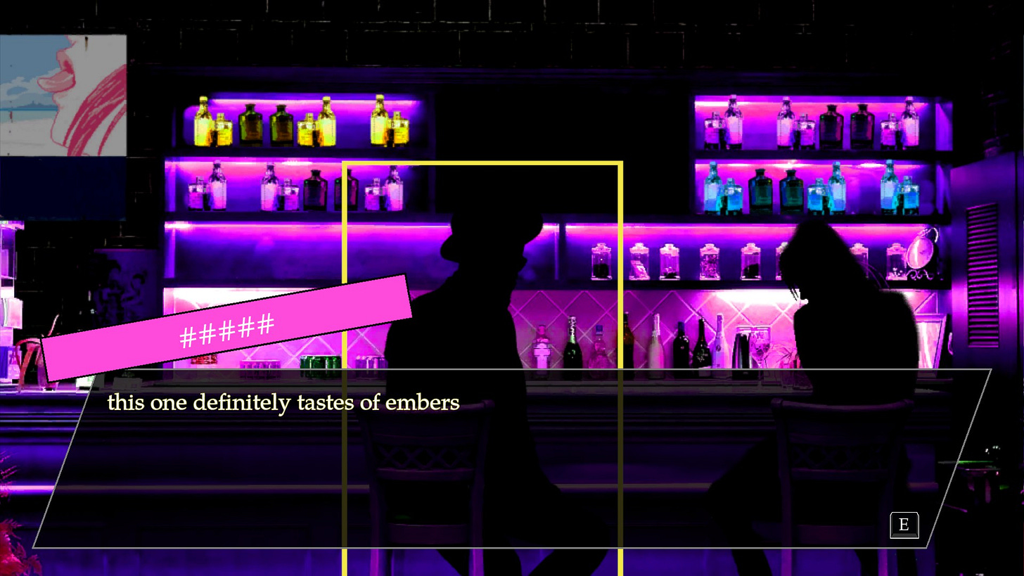 After that, it’s off to a bar on the 25th island where two silhouetted characters are having an even less decipherable conversation about whiskey that is also not really about whiskey.